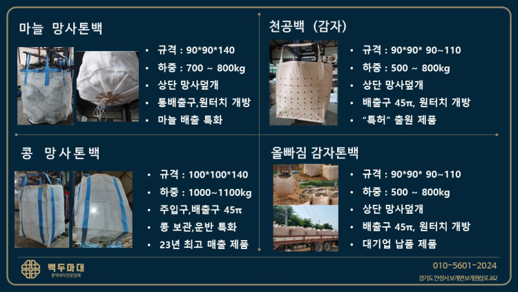 주력 상품 소개 페이지 정보 작성자 관리자 댓글 0건 조회 417회 작성일 24-01-10 11:12 본문 안녕하세요 톤백 맞춤 제작업체 백두마대입니다. 목록 목록 이전글[2024 신제품] 마늘톤백 하부견인고리형 24.05.07 다음글[★통배출구] 마늘톤백 23.04.05